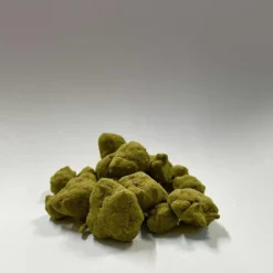 The Moonrocks of this canna cavi strain Cookies and Cream are lighter than their parent strains, being a mossy green with hues of purple and amber pistils. The layer of trichomes further lightens its appearance, and the buds are often dense and shaped like spades.
